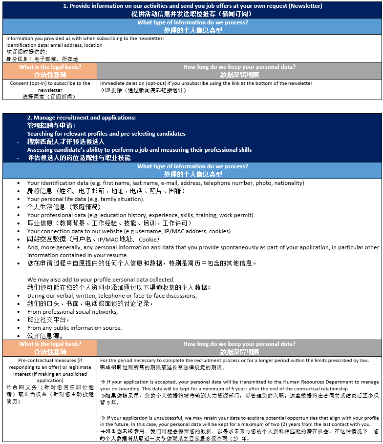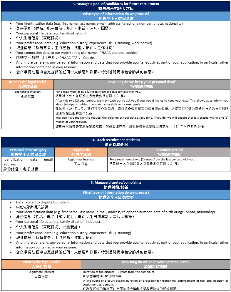 请参阅下表以了解我们在招聘流程中如何处理您的信息。