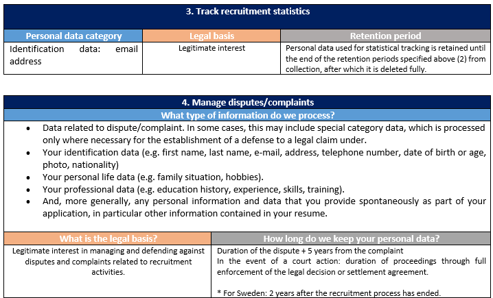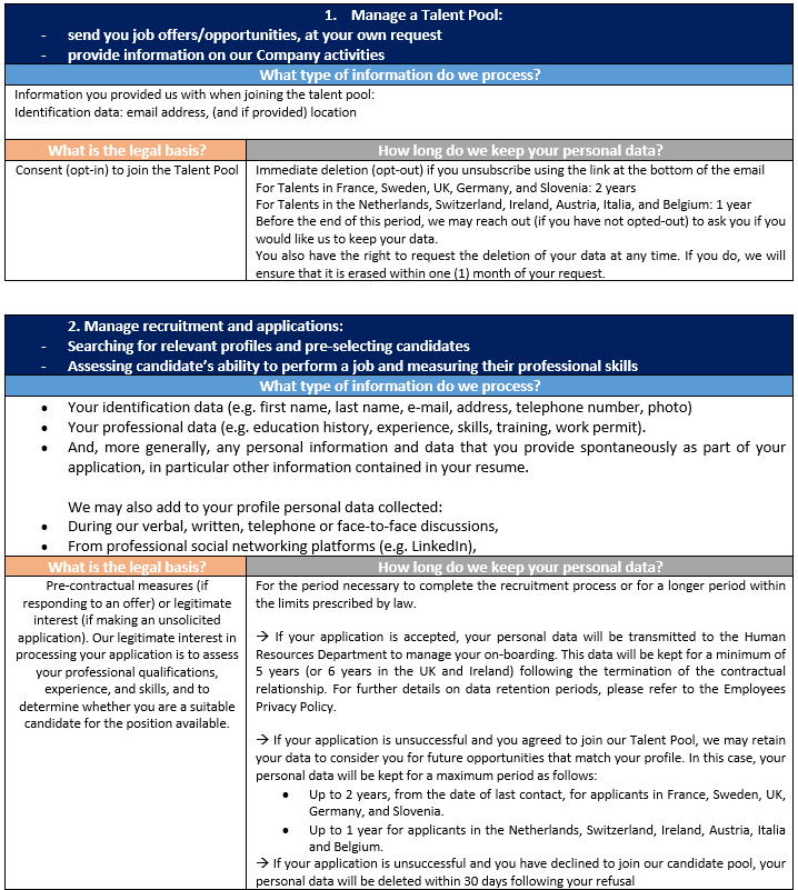 Please refer to the tables below to understand how we handle your information during the recruitment process. Each table is organized by purpose and provides clear details on:
