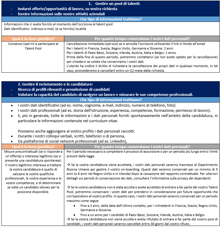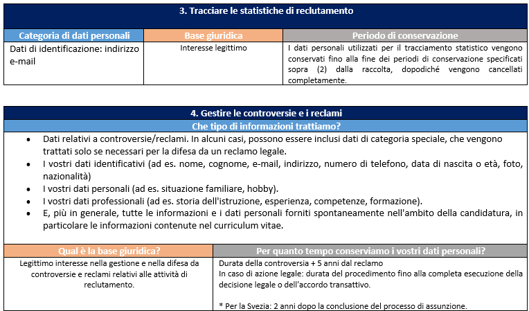 Per capire come trattiamo i vostri dati durante il processo di assunzione, consultate le tabelle seguenti. Ogni tabella è organizzata per finalità e fornisce dettagli chiari su: