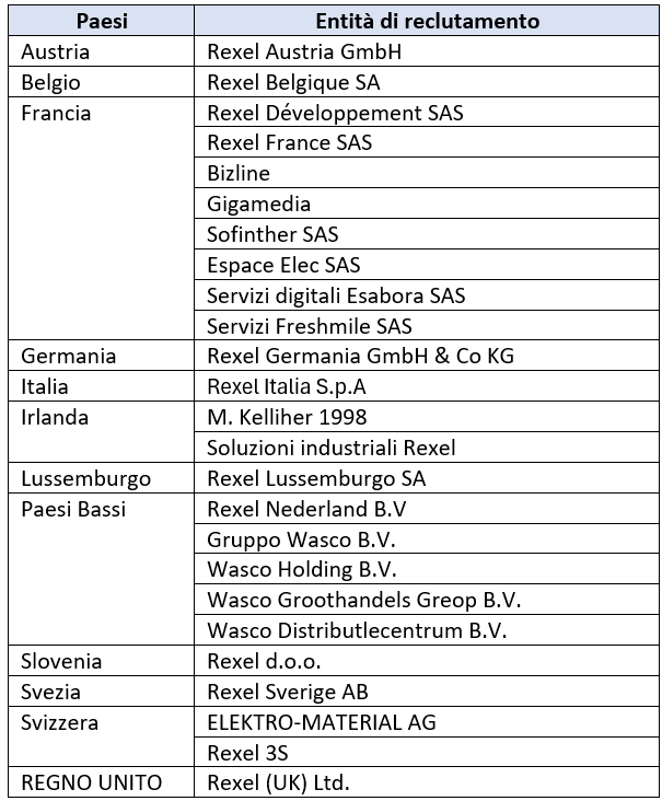 L'ente di riferimento per il quale vi siete candidati, come indicato nella descrizione del lavoro, è il Titolare del trattamento dei dati ("Rexel", "noi" o "ci"), ossia l'ente che determina le finalità e i mezzi del trattamento dei vostri dati personali.