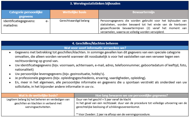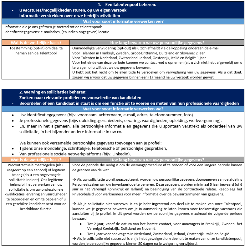 Raadpleeg de onderstaande tabellen om te begrijpen hoe we tijdens het wervingsproces met uw gegevens omgaan. Elke tabel is ingedeeld naar doel en geeft duidelijke details over: