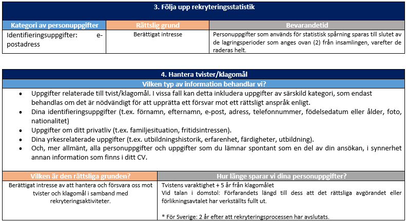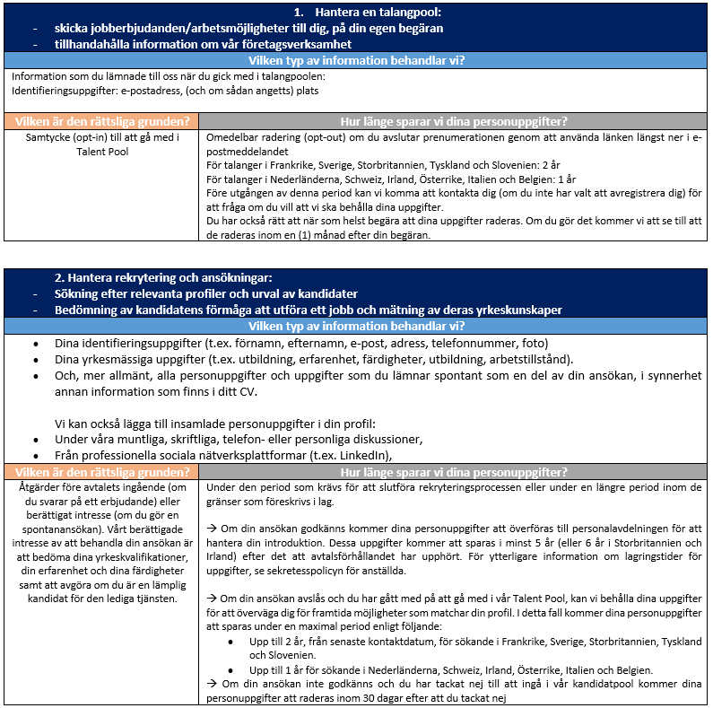 Se tabellerna nedan för att förstå hur vi hanterar din information under rekryteringsprocessen.