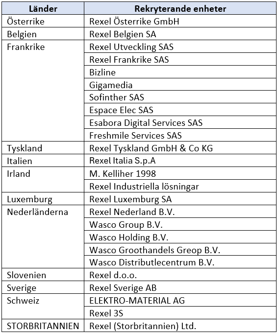 Dina personuppgifter kan också delas med Rexel Développement, som agerar som personuppgiftsbiträde för sina koncernbolags räkning, för att tillhandahålla stödtjänster i samband med rekrytering. Dessa aktiviteter utförs baserat på vårt legitima intresse och styrs av lämpliga koncerninterna avtal för att säkerställa efterlevnad av dataskyddslagar och för att skydda dina rättigheter.